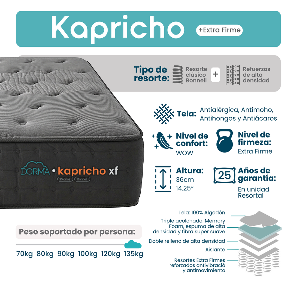 El Kapricho Extra Firme es nuestro colchon tope de linea: extra firme en su nucleo, estable y con un nivel de confort excepcional gracias a su acolchado premium.